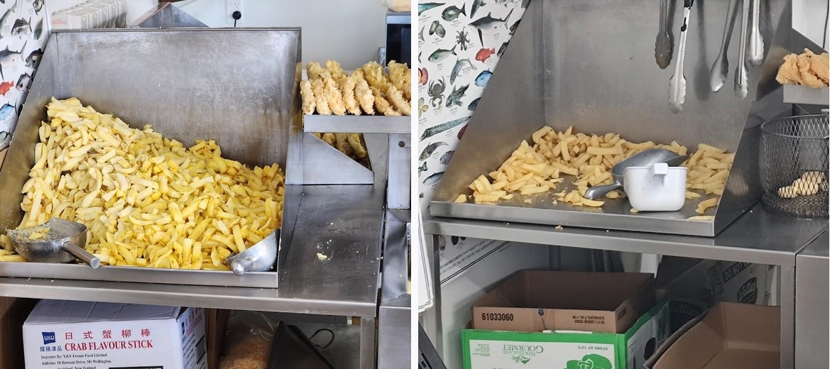 Richmond Seafoods had a high rating on google and also was voted one of the top fish and chip takeaways in Christchurch. We visited today for a takeaway dinner and it didn’t disappoint. We ordered the Blue Cod which was fresh and delicious, chips, potato (cakes) (scallops) (fritter)wontons and chips. Everything was really good. I would recommend getting the sweet n sour sauce for the wontons (which we didn’t) as I’m sure this would be good. Crack open the paper wrap to stop the chips from going soggy.